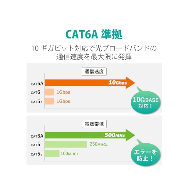 Cat6の2倍である500MHzまでの高周波帯域まで対応し、ノイズ干渉にも強く、高速で安定したネットワーク環境を実現します。