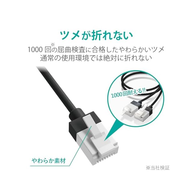 屈曲に対する耐久性が高い素材のコネクターを採用し、ツメが折れにくいLANケーブルです。 ※1000回の屈曲検査に合格(当社検証)