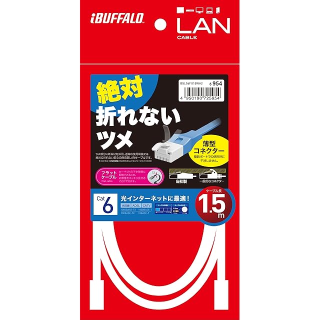 商品名:バッファロー BUFFALO ツメの折れないLANケーブル カテゴリー6 ストレート フラット 1.5m ホワイト BSLS6FU15WH2