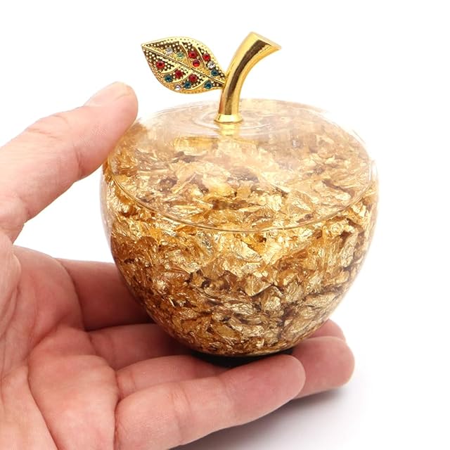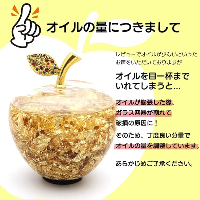 <p>金箔入りの黄金のリンゴの置物です。</p> <p>金運や財運アップの招財アイテムや玄関やリビングなどのインテリアとしてもオススメです。</p> <p>可愛い専用ギフトボックスに梱包されてますので、プレゼントとしても最適です。</p> <p> </p> <p>◆「りんご」とは</p> <p>りんごの置物は、「お金がたまる林檎」として、財運を呼び込むと言われたり、恋愛運アップに特化する効果があると言われています。</p> <p>フルーツは、基本的に物事が実るエネルギーが含まれており、人との出会いや恋愛、結婚、縁のエネルギーがあるとされています。</p> <p>風水では、金色は最も「金運に直結しやすいカラー」とされています。<br> 設置場所は場所は「西の方角」に置くと良いとされています。</p> <p>◆サイズ<br> ・サイズ:高さ9cm、直径約8cm、約260g、ケース約14.5×10.5×9cm</p> <p>◆備考<br> ※葉っぱに散りばめられたストーンはランダム配置になります。配色、配置をご指定いただくことは出来ません。<br> ※専用の箱がついておりますが、海外仕入れの為、つぶれていたり汚れている物が御座います。予めご了承のほどお願い申し上げます。<br> <br> <br> ◆注意事項<br> 本商品には、リンゴの容器の中にミネラルオイルと金箔が入っております。<br> ミネラルオイルには熱膨張の性質があり、高温になる場所や直射日光があたる場所、温度変化が多い場所には置かないようにご注意ください。<br> <br> <br> 日陰になる場所や、温度変化の少ない場所がおすすめです。</p>
