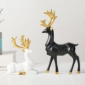 トナカイがモチーフのオブジェです。 シンプルでお洒落なインテリア雑貨です。幾何学的なラインが特徴のモダンなデザイン。ブラックとホワイトのコントラストにゴールドの角が映え、高級感を演出します。角の部分は光を受けるたびに美しく輝き、お部屋に華やかさを添えます。