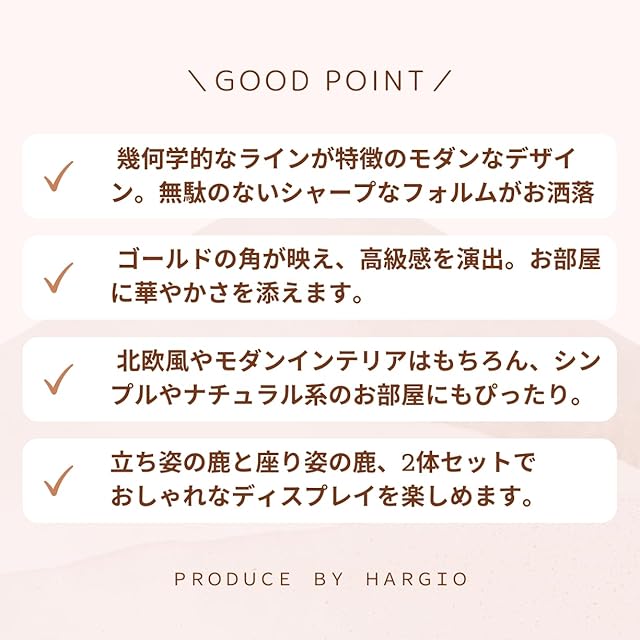 立ち姿の鹿と座り姿の鹿、2体セットで販売。異なるポーズが生み出すリズム感が空間に奥行きを与え、おしゃれなディスプレイを楽しめます。