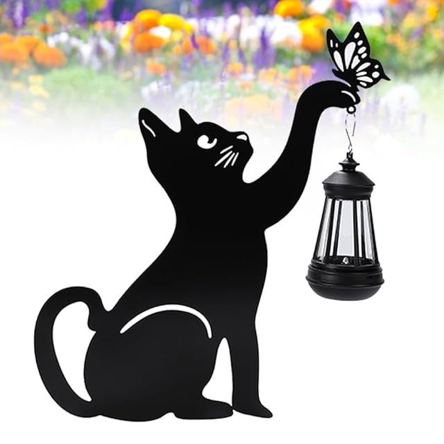 お洒落で可愛い猫のガーデンプレートです。ソーラー式のランタンが暗くなると自動的に光る仕様となっております。