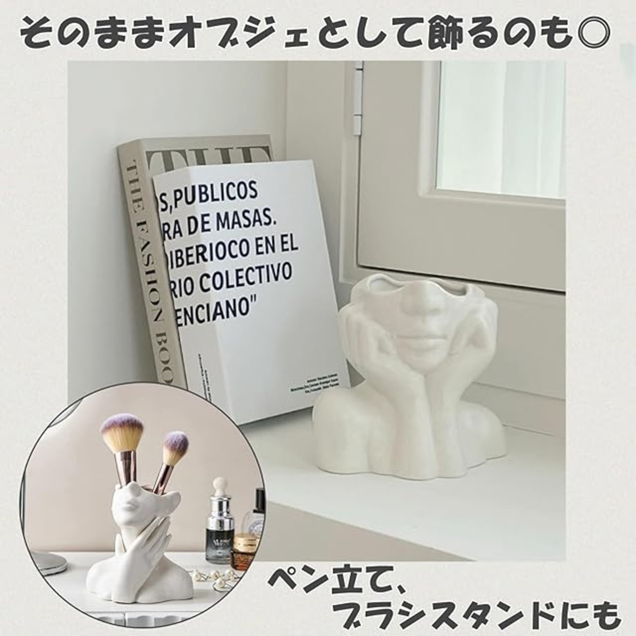 女性の顔と手をモチーフにしたインパクト抜群の花瓶です。お花を飾っていない時でも存在感があるので、そのままオブジェとして置いておくだけでもインテリアのアクセントに◎ シンプルなホワイトカラーなのでどんな色のお花にもマッチします♪飾るお花のカラー・種類次第ではまるでヘアアレンジをしているかのようなユニークなデザインの花瓶です。 個性的なデザインのフラワーベースは1つあるだけでグッとおしゃれ空間を演出◎お花の種類によって様々なアレンジを楽しめるので、季節に合わせてチョイスしたりすることでお部屋を明るく彩ります。 生花はもちろん、ドライフラワーや造花で飾ったり多肉植物でアレンジしたり、あるいはペンやジュエリーなどの小物を入れたりするのもオススメです◎使い方色々なので、アーティスティックにアレンジしてお部屋を彩るアイテムとして活躍します。 【サイズ / TypeA:12.5cm×11.5cm×8cm / TypeB:11cm×12.5cm×8cm】【素材:合成樹脂】※お使いのデバイスやモニター設定または商品撮影の際の照明・日光による光の当たり具合によりカラーが実際の商品と異なって見える場合がございます。予めご了承くださいますようお願い致します。【商標登録番号:第6500459号】