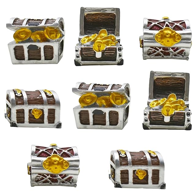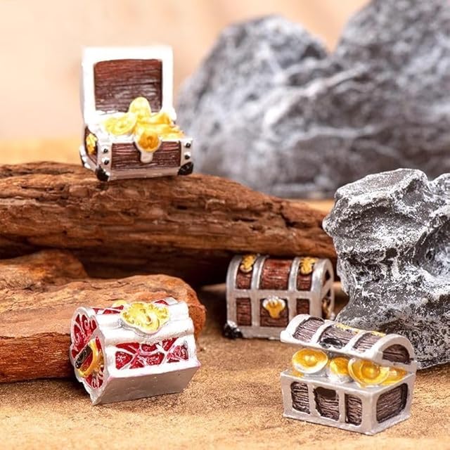 本品は、金の精巧な装飾とブロンズ風の仕上げが施された、高品質樹脂製のミニチュア宝箱オーナメントの8個セットです<br>水中での使用に適しており、アクアリウムや水槽の景観を格段に引き立てます<br>朽ちた木の質感や、しっかりとした金属の留め金、刻まれた紋様など、一つひとつにこだわりが詰まっています<br>沈没船や海賊をテーマにした世界観を作り上げたい方はもちろん、ファンタジーあふれる幻想的な水景にちょっとしたアクセントを加えたい方に最適です<br>これらのミニチュア宝箱は、ご覧になる方の想像力と興味をかき立て、会話のきっかけとなること間違いありません。