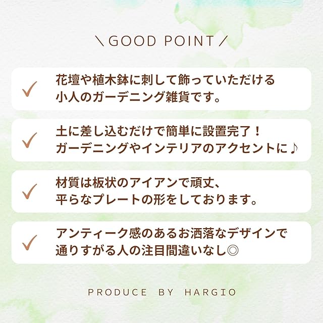 材質は板状のアイアンで頑丈、平らなプレートの形をしております。土に差し込むだけで簡単に設置完了!