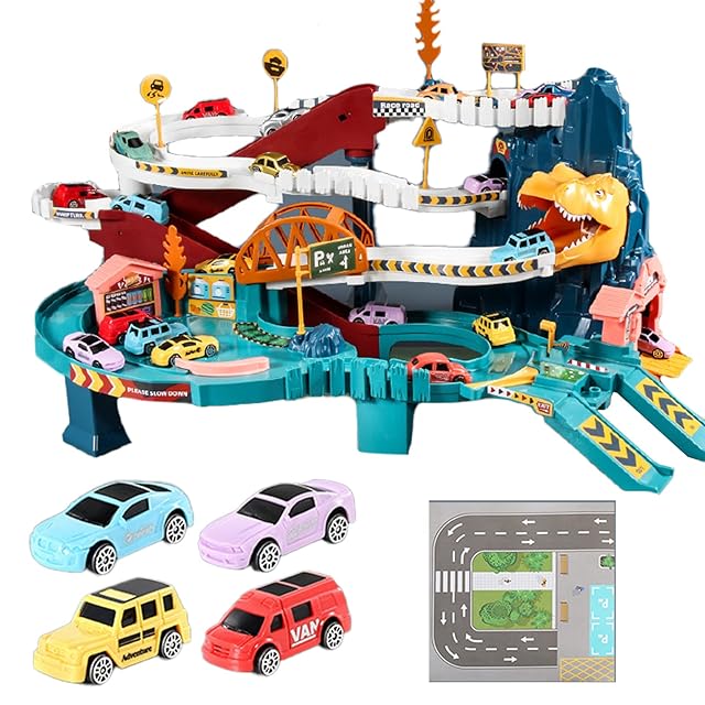 【ダイナソーごっこ遊び】大冒険のレールセットはカラフルなミニカーが螺旋階段を登り、レールの上を軽やかに走ります。駐車場、トンネルなど子供たちの好奇心をそそります。