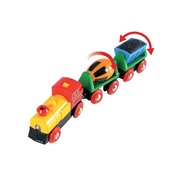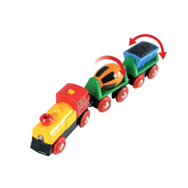 【ブリオの木製レールで遊べる電動車両のセット】前進・後退・ライト点灯のアクション付。車両が動き出すとミキサーが回転します。石炭車は動くと左右にゆらゆら揺れます。