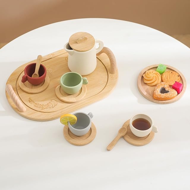 Wooden Teether アフタヌーンティーセット おもちゃ おままごと 木のおもちゃ シリコン製 お茶会 ティーセット ティートレイセット ごっこ遊び コミュニケーション能力アップ 知育玩具 出産祝い 入園祝い 親子遊び 保育所・児童館用品 誕生日 クリスマス 新年 贈り物 14点