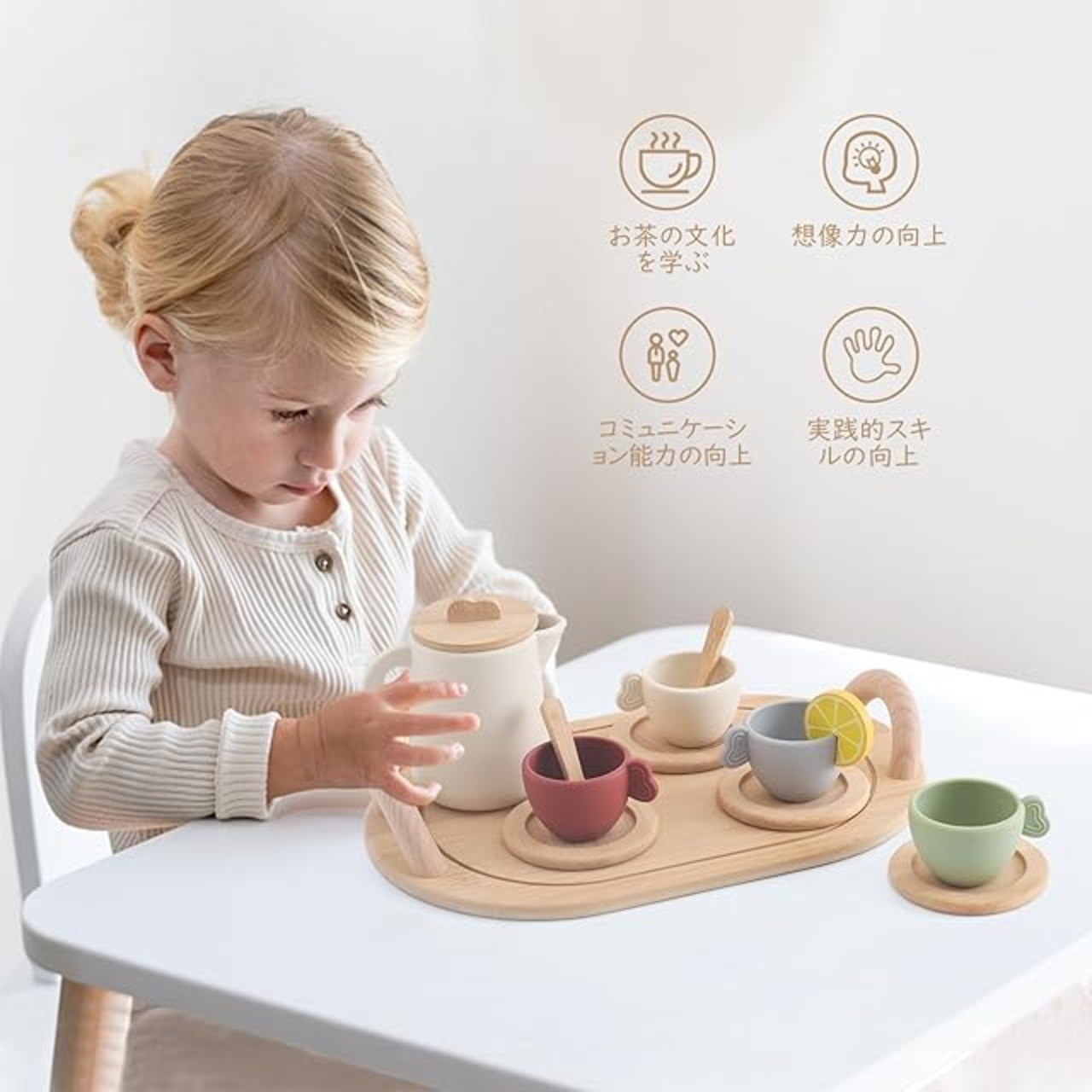 【安心・安全】お子さまの健康と安全のために、アフタヌーンティーセットには天然木と柔らかいシリコンを使用しています。絶妙な仕上がり、角が丸くて、ケガをする心配がなく小さな子供も安心に遊べます。