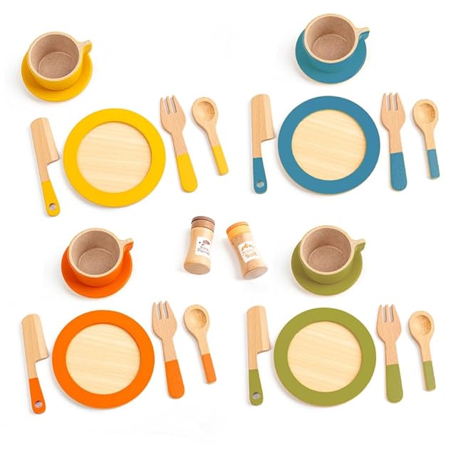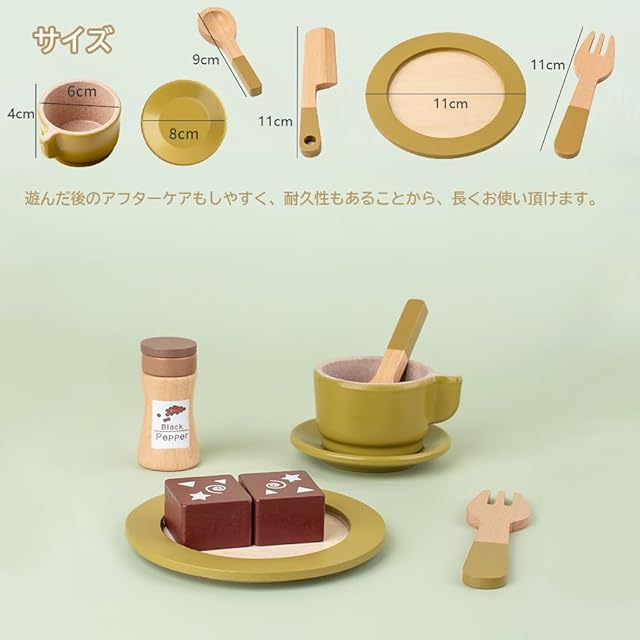 【内容物】お皿x4、ナイフ×4、フォーク×4、スプーン×4、カップ×4、ソーサー×4、塩入れ×1、こしょう入れ×1。子供たちがごっこパーティーを演出できるように、4 人分の食器が含まれています。みんなでわいわい楽しいディナーパーティーの始まりです!<br> 【商品説明】材質:天然木、再生木粉。 梱包サイズ:幅21.5cm × 奥行6cm × 高さ18.5cm。 重量:0.75kg。<br> 【楽しい時間を一緒に】子どもたちが自主的に遊べるおままごと食器セットです。お友達または家族と一緒にパーティーごっこ遊びをして、お子様の想像力や創造力を育み、コミュニケーション能力や表現力を向上させることができます。<br> 【ギフトにぴったり】小さなお子様と一緒にパーティーをしたり、一緒におしゃべりしたり、遊んだり、楽しいリラックスタイムを過ごすことができます。誕生日、クリスマス、新年、出産祝い、入園祝いや入学祝いなど、お子様へのプレゼントにおすすめです。男女を問わず幼児受けの良い玩具なので、孫にプレゼントもオススメです。<br> 【安心】Three pointで商品をご購入いただいたお客様に「安心」サービスを提供しております。万が一商品は初期不良や不具合がある場合は、ご連絡いただき不良と確認いたしましたら返品・交換ご対応いたします。<br>