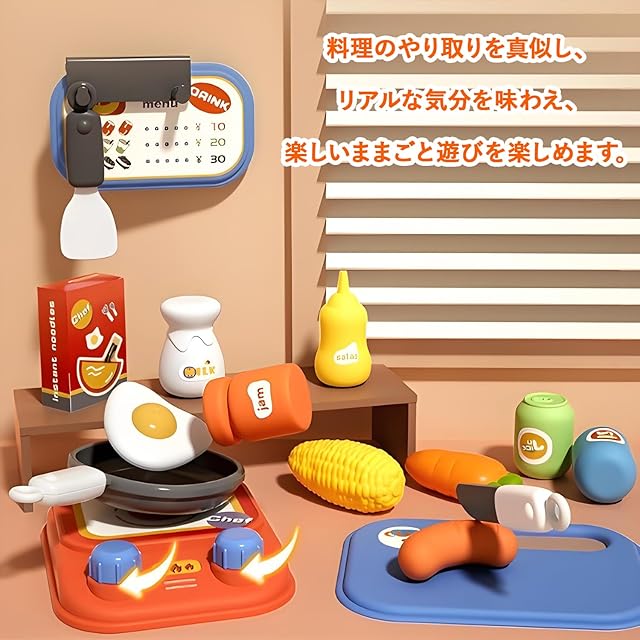 【おままごと調理セット】リアルな調理器具、食材を切ることで、料理人ごっこに夢中しよう!セット内容:フライパン*1 調理器具*6 ナイフ*1 プレート*1 まな板*1 卵焼き*1 ホットドッグ*1 イチゴ*1 とうもろこし*1