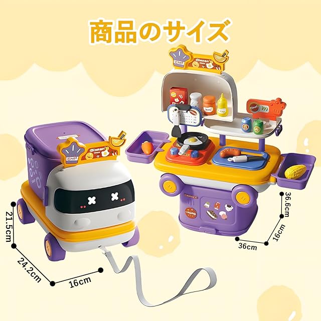 【どこでもキッチンセット】車に移動できる台所本体、野菜、果物、調味料、キッチン用具、調理器具などバリエーション豊なキッチントイおもちゃで、お子様一人でも 、お友達や家族と一緒に楽しく遊びます。