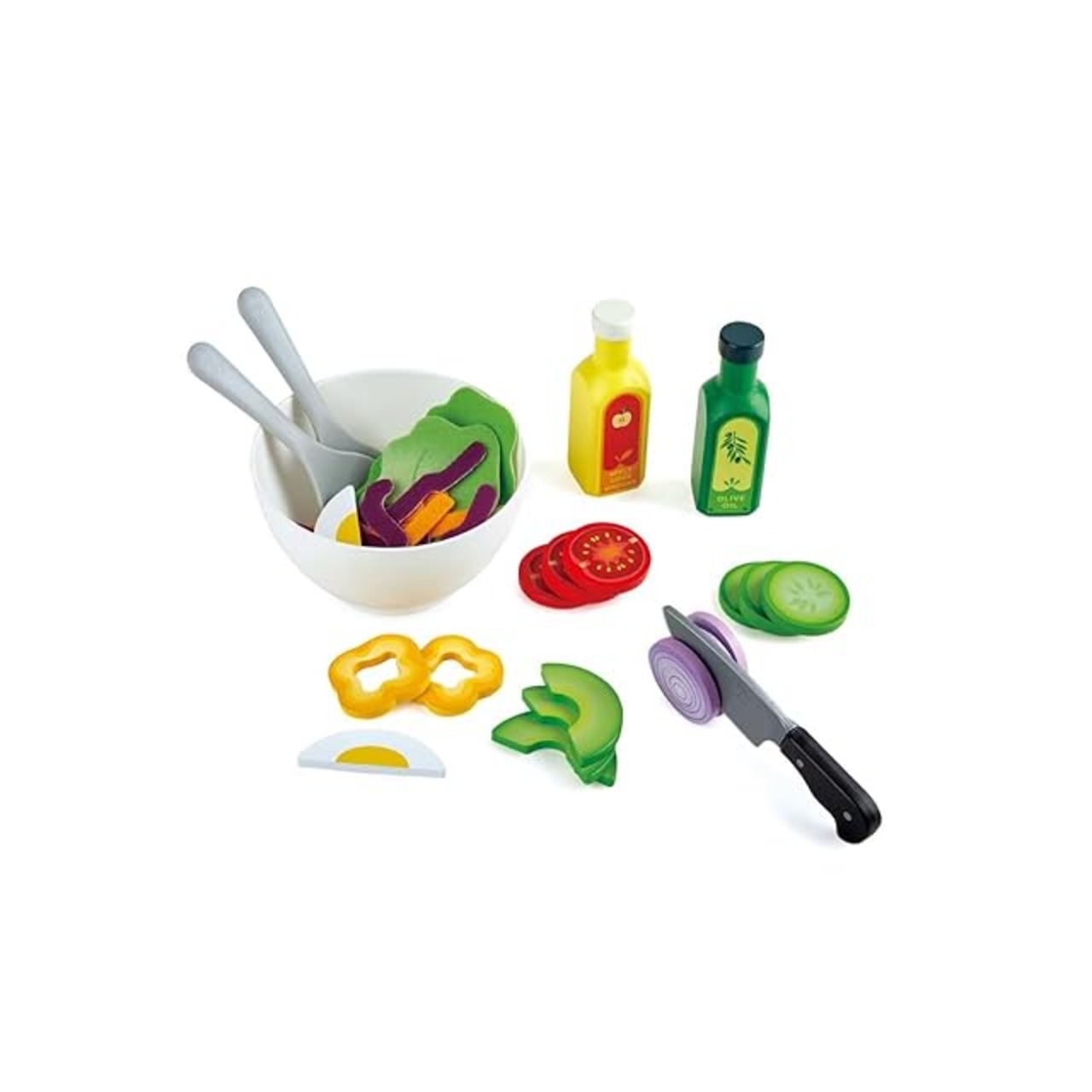 野菜や包丁、ドレッシングもついた本格的なおままごとが楽しめるサラダセットです。ボウルやオリーブオイル、ドレッシング、玉ねぎ、トマト、パプリカ、きゅうり、アボカド、ゆでたまご、にんじん、紫キャベツ、レタス、包丁、スプーン、フォークが入っています。