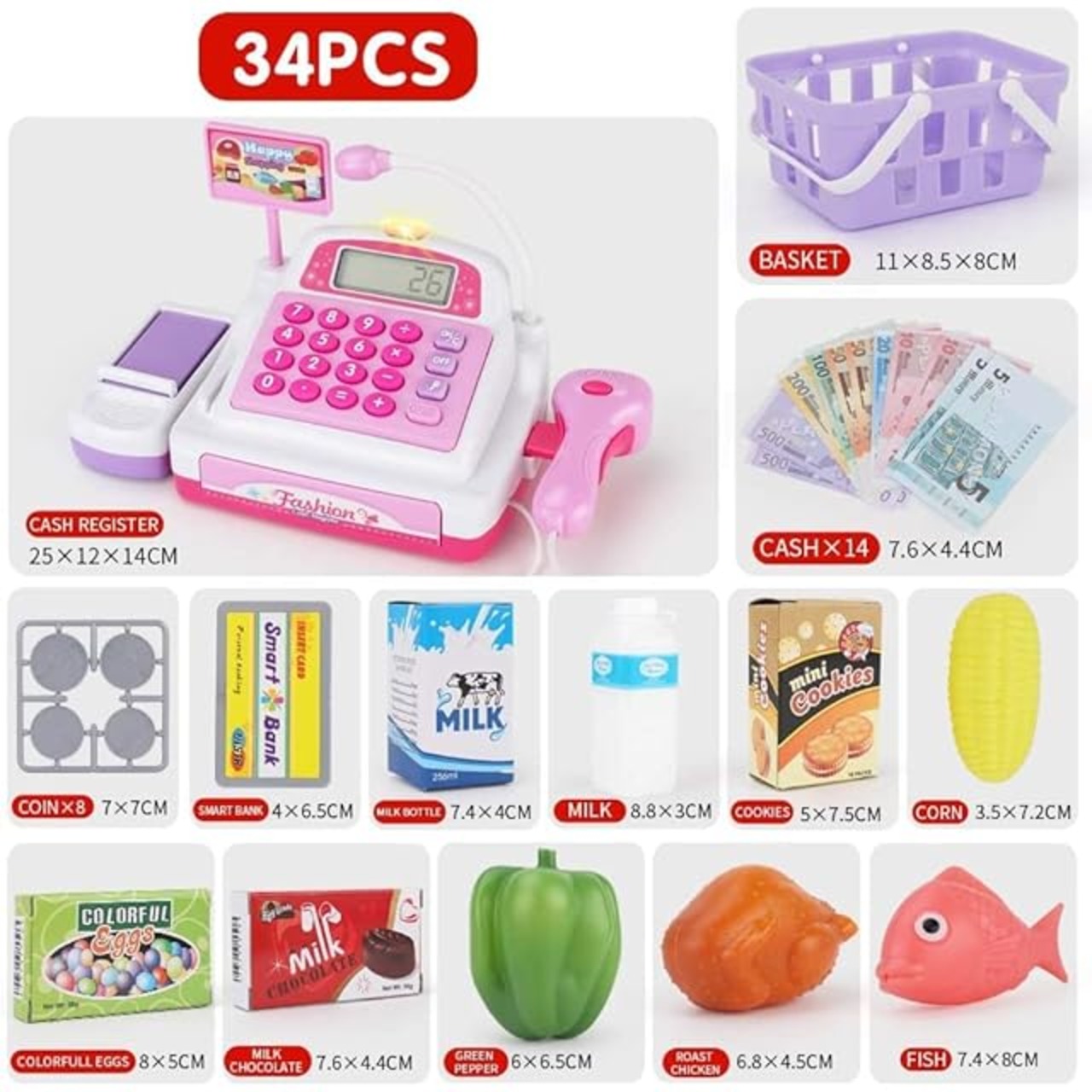 【34PCSのレジスターセット】レジスター本体、お買い物のかご、お札、コイン、クレジットカード、お菓子、ミルク、クッキー、コーン、魚、ローストチキン、ピーマン、ミネラルウォーター、ミルクチョコレートなどが含まれて、豊富なお買い物ごっこセットです。