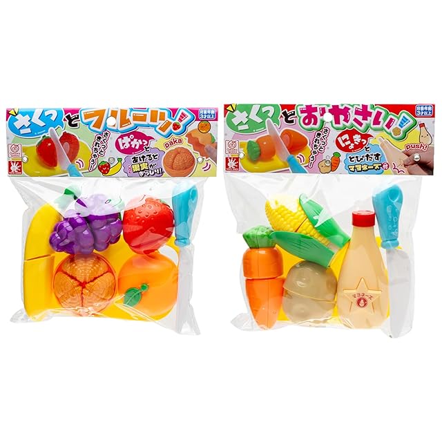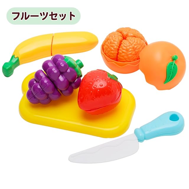 セット内容:フルーツ(イチゴ・ブドウ・バナナ・みかん)、お野菜(じゃがいも・トウモロコシ・ニンジン)、マヨネーズ、まな板×2、包丁×2