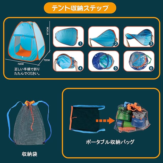 「丈夫な素材広い空間」キッズテントはポリエステルを採用され、無毒で無臭、洗いやすい、メッシュ生地で通気性も良く、しかも中にいるお子さんの様子が見えてママも安心です。テントは大きい空間を占めない、大きさも子供2人入れるサイズで楽しく料理を中で作ったり、本を読んたり、休憩したり、かくれんぼしたり、自由的に遊びたり、最高です。