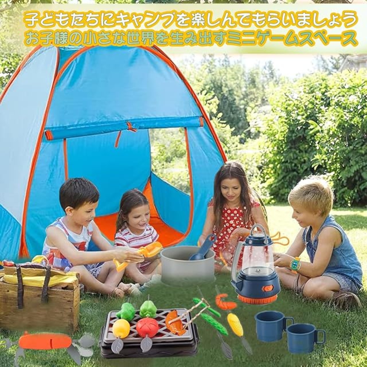「豪華なキャンプセット」小さな探検家にとって必需品:折りたたみ式ワンタッチテント(サイズ 80*80*90cm)、収納袋、電池式ランタン(別途単3電池必要)、調理パン、水カップ、BBQグリル、串焼きセット、多機能ナイフフォーク、がたくさん含めている豪華なセットです。かわいいディザインの子供テントトは室内外を問わず、おもちゃ、おままごと、テントハウス、秘密基地や知育玩具などとして遊びに最適です!お子様の想像力や創造力も豊かにしてくれます。