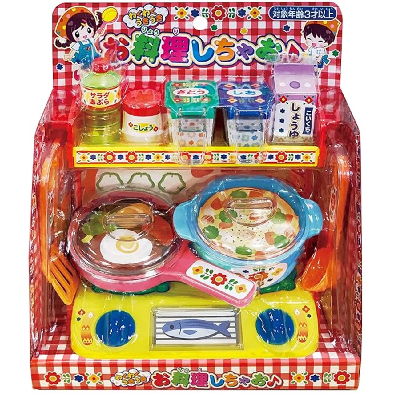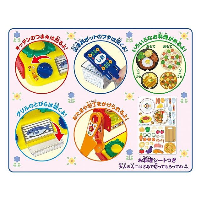 ガスレンジやお鍋にフライパン、調味料も盛りだくさんで、お料理あそびが楽しめます。付属のお料理シートは切り取って遊べます。