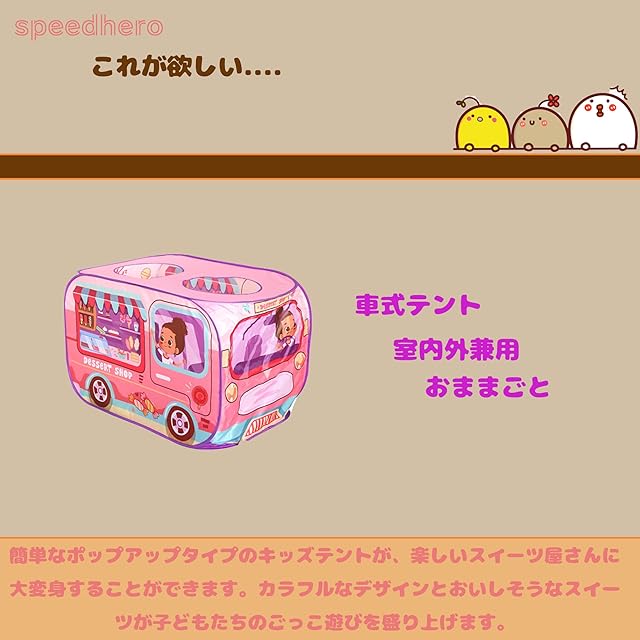商品名:キッズテント 車式テント 家 室内外兼用 キャンプテント おままごと 知育玩具 親子遊び ボールプール 収納袋付き ワンタッチ開閉 子供用プレイハウス 折りたたみ おしゃれ 室内外遊具 男の子 女の子 おもちゃ パーティー ギフト 贈り物 (スイーツ屋さん)