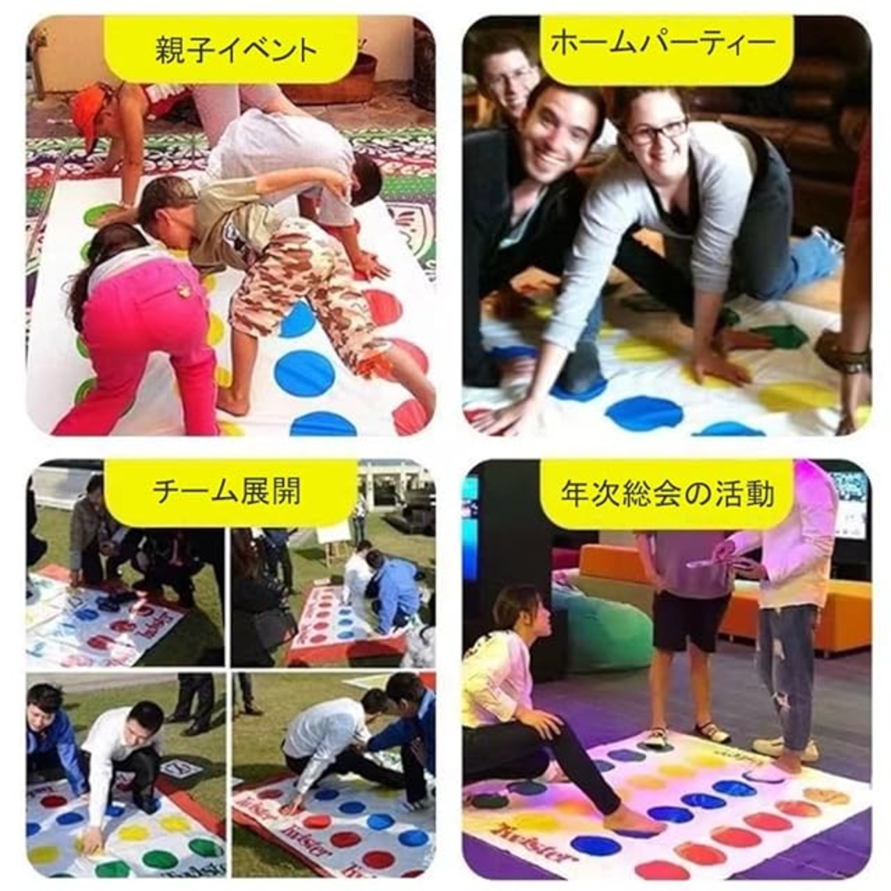 【簡単なルール】バランスゲームは、誰でも簡単に遊べるパーティーゲームです。マットの上にある4色のマーカーの上に足や手のひらを置き、指示された通りに置き続けます。 手のひらと足以外でマットに触れ、バランスを崩して倒れたら負け、最後まで残った人が勝者となります。 このゲームは、子供から大人まで幅広い年齢層で楽しめます。