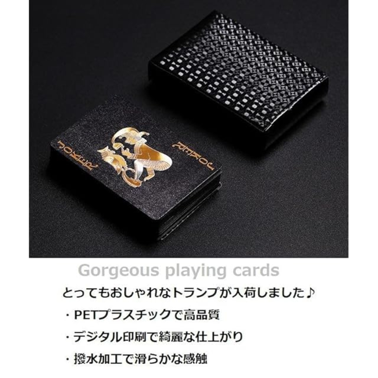 ■特徴<br>とってもおしゃれなトランプが入荷しました♪<br>・PETプラスチックで高品質<br>・デジタル印刷で綺麗な仕上がり<br>・撥水加工で滑らかな感触<br><br>■カラー<br>A-ブラック/カーボン<br>B-ゴールド/スカル<br>C-シルバー/ドル<br>D-ピンクゴールド/薔薇<br>E-ブラック/スカル<br><br>※カラーは各々のモニターにより、多少の違いがある事、ご了承下さいませ。<br><br>■サイズ cm<br>横5.7×縦18.7<br><br>■素材<br>プラスチック<br><br>■注意点<br>※メーカーの製造ロット差で多少 デザインが変更になる場合があります。<br>※海外輸入の商品になりますので多少の汚れ、傷がある場合があります。<br>