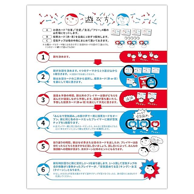どんなゲーム?:「みんなで空気読み。究極の⼆択」は親プレイヤーの選んだ究極の二択の選択を「空気を読んで」当てる、バランスゲームを題材としたコミュニケーションゲームです。わかりやすくシンプルなルールで、ボードゲーム初心者同士でもすぐに楽しめます。※TVゲーム版「みんなで空気読み。」とはルール、遊び方が異なります。 このゲームをプレイすることで相手の価値観(考え方)の理解度が深まり、友人関係、信頼度のUPに繋がること間違いなし!アイスブレイクなどにも活用できます!