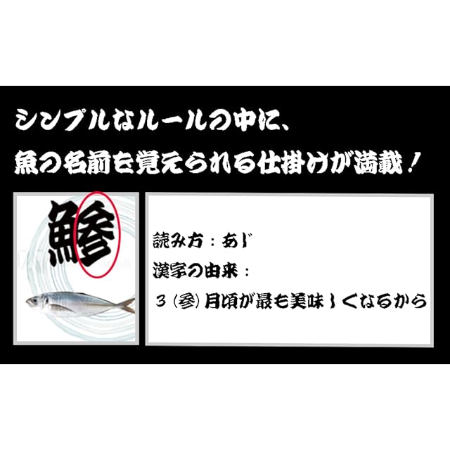 「鰯」「鰤」「鰰」・・・ この漢字の読み方、わかりますか? そう、魚へんの漢字って普段は流してしまうんですが、お寿司屋さんなんかで見ると、ふと気になったりしますよね。 読めないとちょっと恥ずかしいし、読めたらきっとドヤ顔が出来るはず。 1-6名で遊べ、対象年齢は7歳以上、およそ20分程度のゲームです。 ルールもとてもシンプルで説明も(ほぼ)不要。トランプと同じサイズなので持ち運びも楽々。 なので、『子どもと一緒に』また『キャンプ』や『飲み会』などさまざまなシーンでお楽しみいただくことができます。