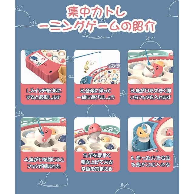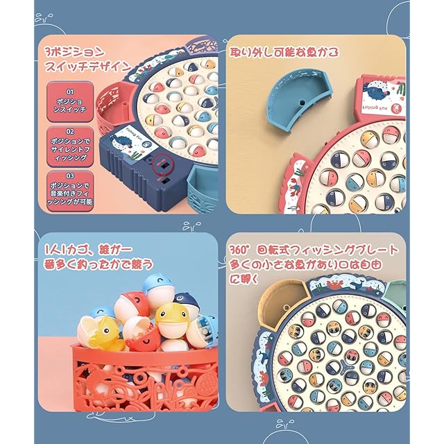 【高品質】品質が良い、耐久性を持って長く使えます。更に全体的に丁寧な加工をしており、おもちゃの表面は滑らかでささくれがない、けがのことが心配なく。 【親子インタラクション】釣り玩具には4本の釣竿がついています。赤ちゃんは仲間と遊んでお互いの友情を深めることができ、親と遊んだり、面白い親子インタラクティブを楽しみます。 【楽しみを体験】赤ちゃんに釣りの基本的なスキルや感じを体験させ、赤ちゃんに楽しみを与えられるほか、赤ちゃんの想像力を豊かにすることができます。 仕様: 材質:プラスチック サイズ:30*30*4cm 重量:400g パッケージ内容: 回転ルーレット*1 魚のプレート*4 小さな魚*55 釣竿*8 1.5Vの単3形電池*3 バッテリーチャージャー*1 注: 小さいパーツがあります、必ず大人の監督の下で遊んでください。 撮影時の照明やPC設定環境によりまして、画面上と実物の色具合に差異がある場合がございます。手動測定による1-3cmの誤差を許容してください。 運送中に物流などの原因で箱が破損する恐れがありますので、ご了承ください。不良品がありましたら、お気軽にご連絡ください。
