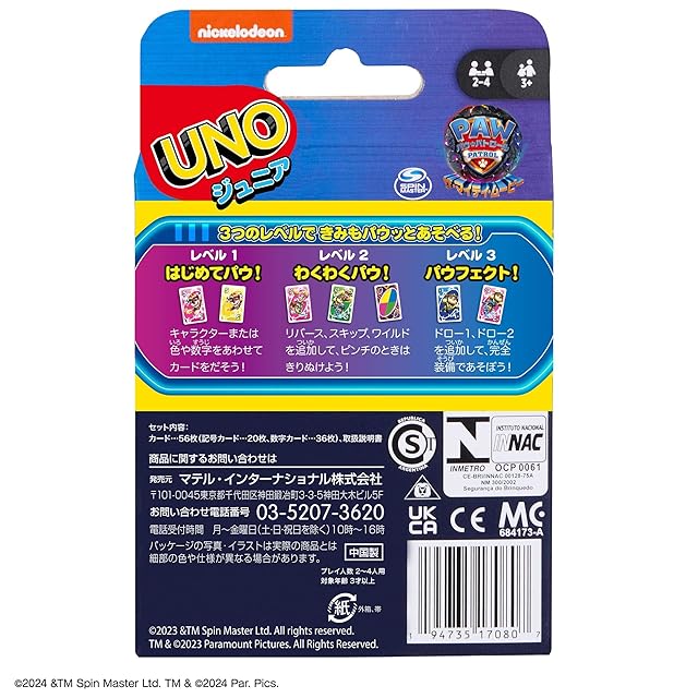 【内容】3才からの小さなお子さまでも楽しく簡単ルールで遊べるウノジュニアから、パウ・パトロール ザ・マイティ・ムービーとコラボした商品が登場!ウノ ジュニアは簡単ルールで3才から遊べる!【レベル1】キャラクターと数字を合わせてカードを出す【レベル2】リバース・スキップ・ワイルドも追加して遊んでみる【レベル3】ドロー1,ドロー2も追加して遊ぶ。小さなお子さまが初めて“ルール”のある遊びをしたり、数字や色を遊びながら学べる学習ツールとしても最適!