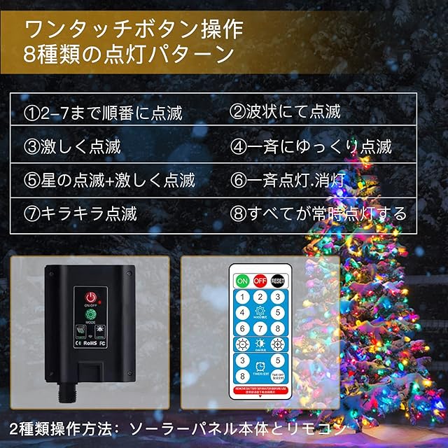 【8種類の点灯パターン】全点灯、波の変化、点滅 、呼吸灯、走馬燈など全8種類の点灯モードが付き、コントローラーのボタンを押すたびに点灯パターンが切り替わります。一つボタンで8種類の発光パターンが楽しめます。それとリモコン付きなので、遠距離でも点灯パターンが切り替えます。シーン、気分、お祭り、クリスマス、記念日などに合わせて調整できます。