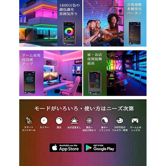 【多種発光モード・多機能RGBライト・DIY可】1600万色・ミュージッとクシンクロ点滅・マイク音識別点滅・多種点灯効果・タイマー設定点灯等。本ledライトテープは色、明るさ、点滅速度など調整可能です。