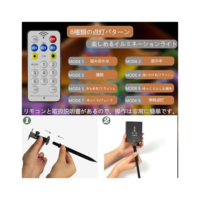 【8種類の点灯パターン・リモコン付き】ソーラー式ソーラーイルミネーションには8つの点灯モードがあり、全点灯、波の変化、連続変更、点滅変更、ちらつき変更、などの点灯モードを切り替えできて、雰囲気に合うモードをお好きに選んでください。リモコンでお好みの光量を自由に選べ、4時間、6時間、8時間のタイマーモードもあります。8種類の点灯パターンで、クリスマス、ガーデン、結婚式、パーティー、キャンプ、ホテル、庭などの装飾としては大活躍です。