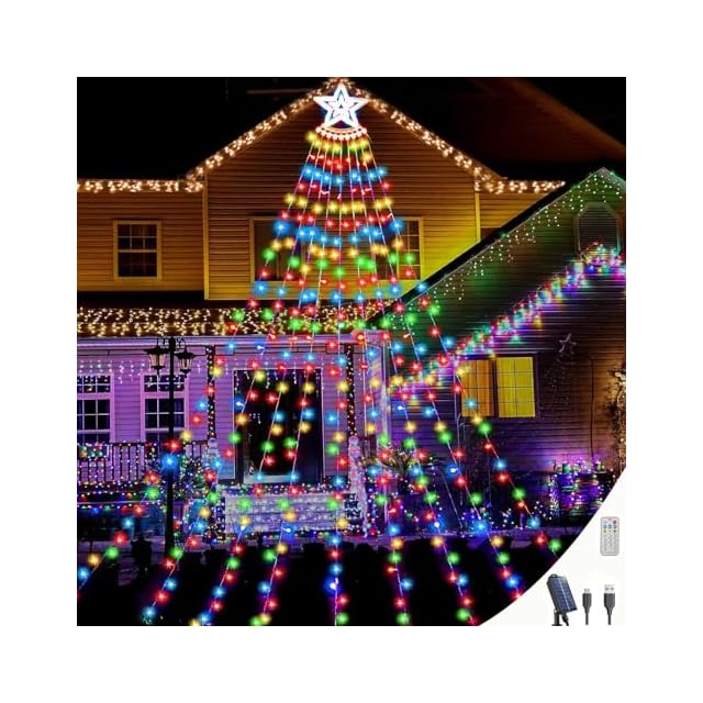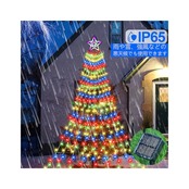 【セット内容】イルミネーションライト*1、ソーラーパネル*1、リモコン*1、日本語説明書付き*1、USBケーブル*1、釘*2、ドレップ固定用フック*10個、ソーラーパネルブラケット*1。長さ:9本*3.5m、電源コードの長さ約5m、重さ:約0.8kg。防水:IP65。このクリスマスイルミネーションライトは、大きな星の下には総計9本の3.5mのストリングライトが垂らされており、350個の高輝度LEDビーズが均等に配置されています。これにより、広範囲に美しい光が広がります。