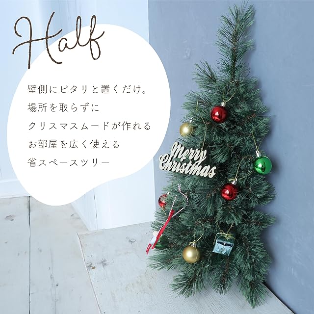 【ハーフサイズの省スペースツリー】 半分のサイズなので置き場所に困らない◎壁に立てかけて通常の半分のスペースでOK!60センチの卓上ミニサイズで壁際や窓際に置くだけなので、玄関やリビング、お部屋など好きな場所にすぐ飾れちゃいます♪