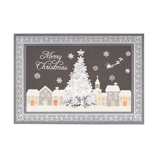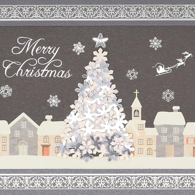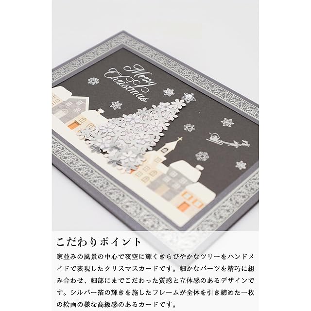 家並みの風景の中心で夜空に輝くきらびやかなツリーをハンドメイドで表現したクリスマスカードです。細かなパーツを精巧に組み合わせ、細部にまでこだわった質感と立体感のあるデザインです。シルバー箔の輝きを施したフレームが全体を引き締めた一枚の絵画の様な高級感のあるカードです。