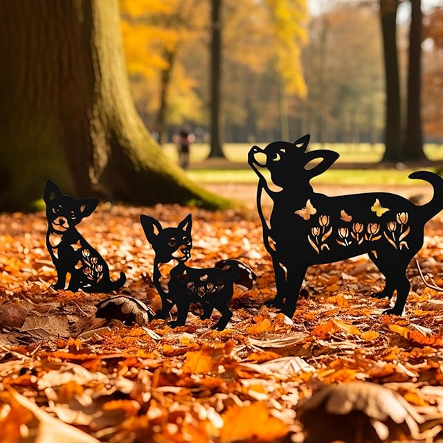 MrMrKura ガーデニング 置物 犬 アイアン 3点セット ガーデンオブジェ チワワ シルエット プレート 動物 彫刻 ガーデン 飾り ガーデンピック ガーデニング雑貨 オーナメント