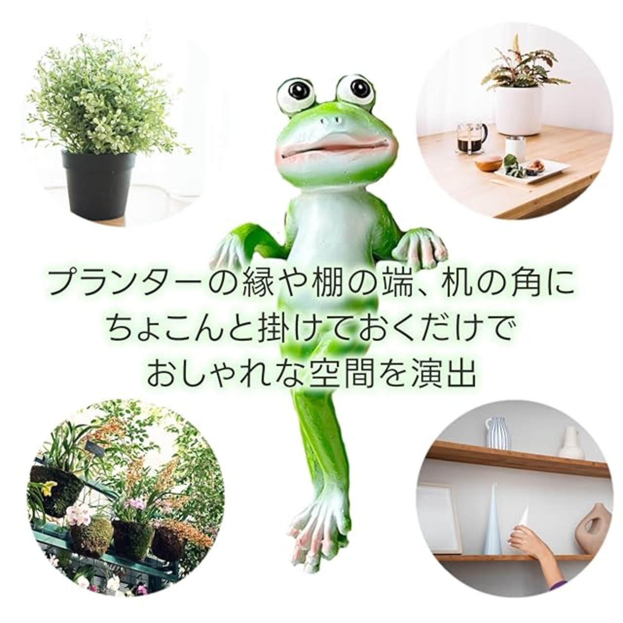 【多彩な使い方】吊り下げられるデザインのカエルの飾りは、プランターの縁や棚の端、机の角にちょこんと掛けておくだけでおしゃれな空間を演出します。 庭の木にぶら下げてガーデニングのアクセントにするのもおすすめ。室内ではリビングや玄関のディスプレイとして活用するのはもちろん、オフィスデスクの癒しアイテムとしてもぴったりです。 使い方次第で、インテリアやエクステリアに独特の可愛らしさをプラスできます。