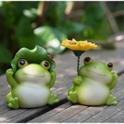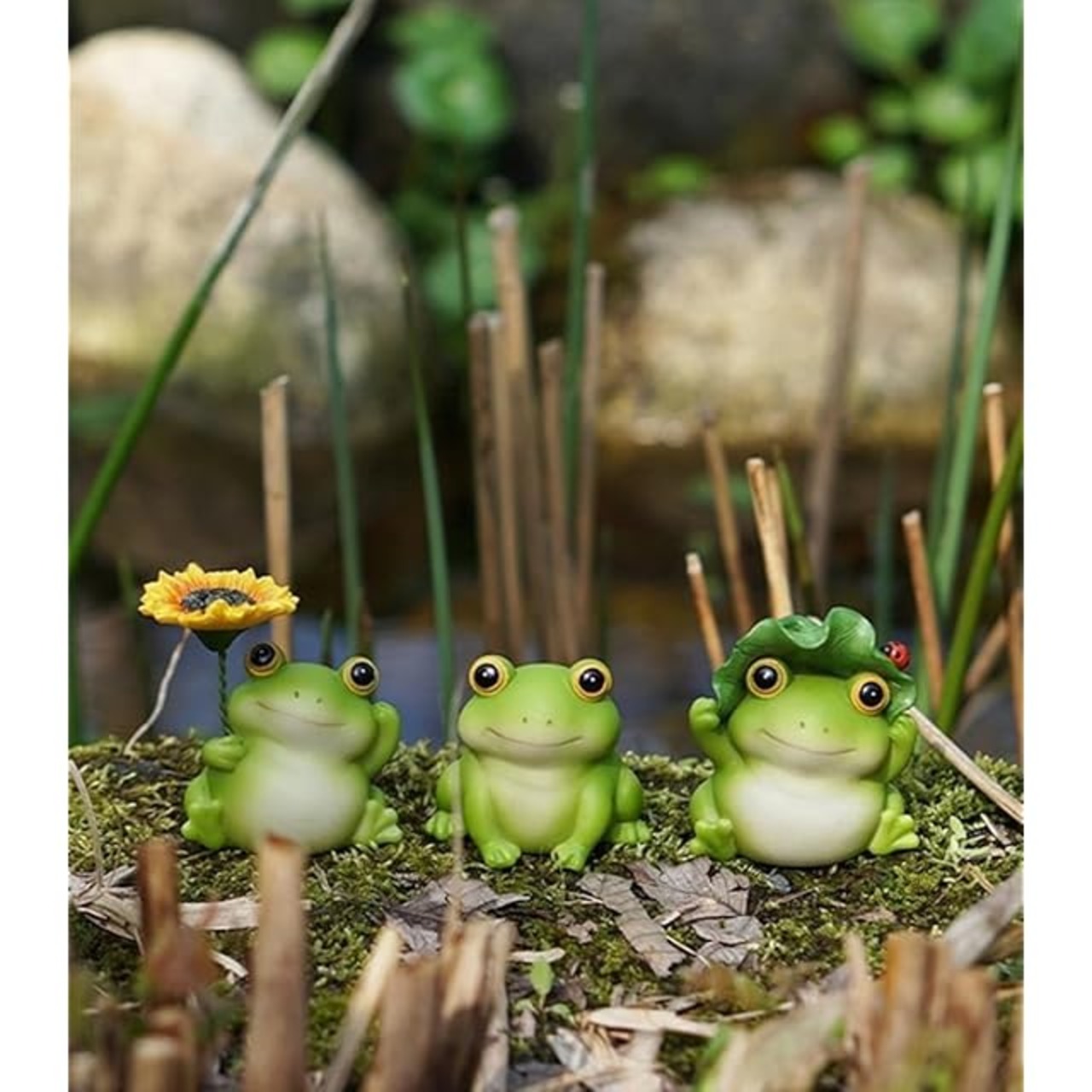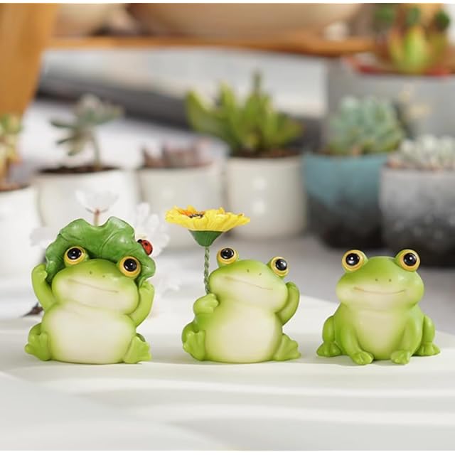 【可愛いカエルの置物】可愛いカエルの置物です。ひまわりを持ち上げるカエル、頭にハスの葉を被るカエル、静かに立っているカエル、可愛くて癒されます。細部まで丁寧に作されて、置くだけで優しい雰囲気に大変身。