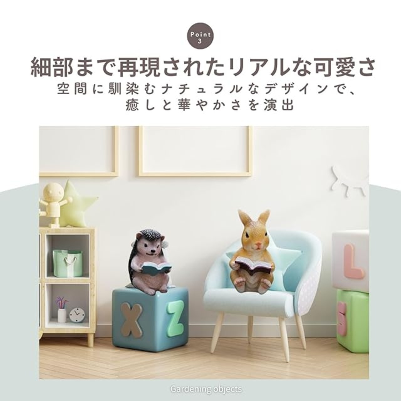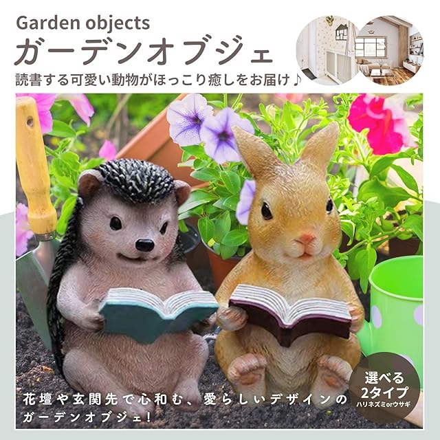 読書姿が愛らしい、癒しのガーデニング雑貨:うさぎが本を読む姿が見る人をほっこりさせるデザインのガーデンオブジェです。花壇や玄関先、ベランダに置くだけで、お庭が癒しと楽しさで満たされます。<br><br>室内外どちらでも楽しめる耐久性:軽量で丈夫な樹脂製素材を使用し、風雨に強い仕様のガーデンオーナメント。もちろん屋外以外にも、室内の玄関、リビング、テーブルの上にも最適。場所を問わず活躍するかわいい、ウサギの庭のオブジェ置物です。<br><br>プレゼントにぴったりの特別感:ガーデニング好きの方やうさぎファンに喜ばれる可愛いアイテム。誕生日、引っ越し祝い、ハロウィンなどのイベントギフトにもおすすめです。<br><br>細部までこだわったキュートなデザイン:リアルさと可愛らしさを兼ね備えた造形で、自然な雰囲気が魅力。どんなインテリアにも馴染み、庭や室内の空間に優しい華やかさをプラスします。<br><br>内容:サイズ:ハリネズミとうさぎからお選びいただけます。ハリネズミ(約高さ14cm、幅9cm、奥行き11cm)、うさぎ(約高さ16cm、幅9cm、奥行き11cm)