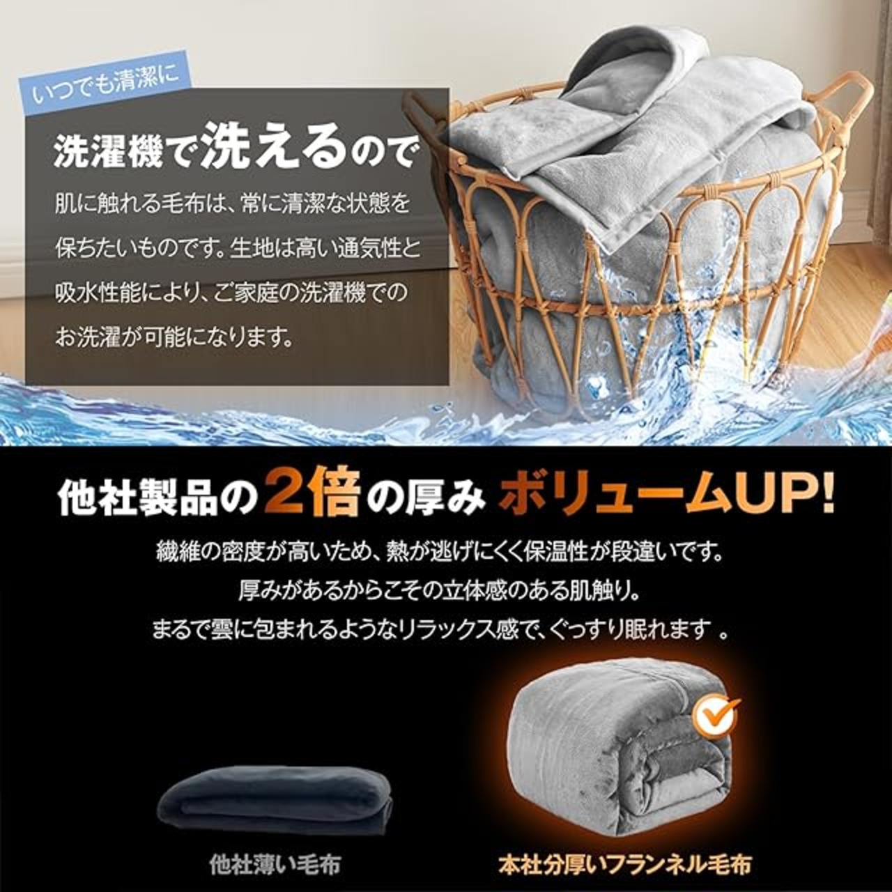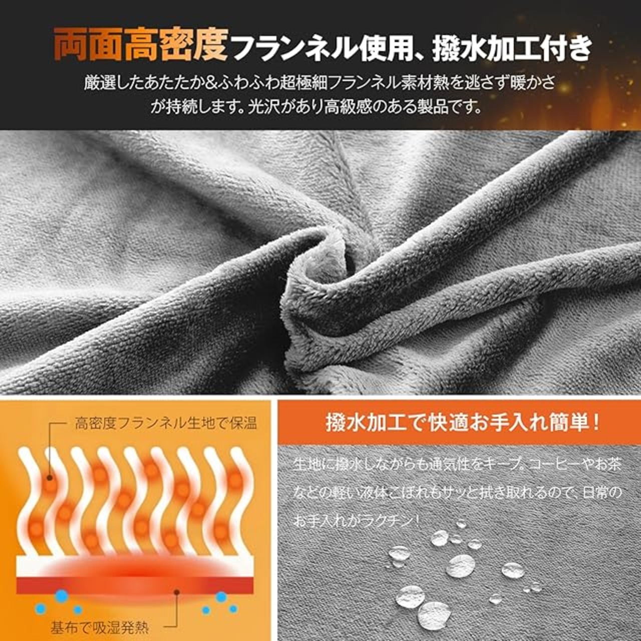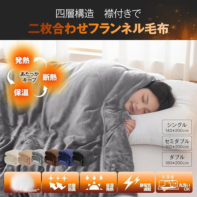 ✨【四層構造・静電気防止】表側と裏側にふんわり柔らかいフランネル生地を採用し、中間には保温性に優れた蓄熱綿と、軽くて薄いシンサレート中綿を充填した四層構造で、抜群の温かさを実感いただけます。さらに、毛布の表地部分には静電気抑制効果のある特殊な糸を使用しており、冬に気になるパチパチとした静電気を最大限抑制します。※ご注意:静電気の発生を抑制する加工であり、完全に除去できるものではございません。