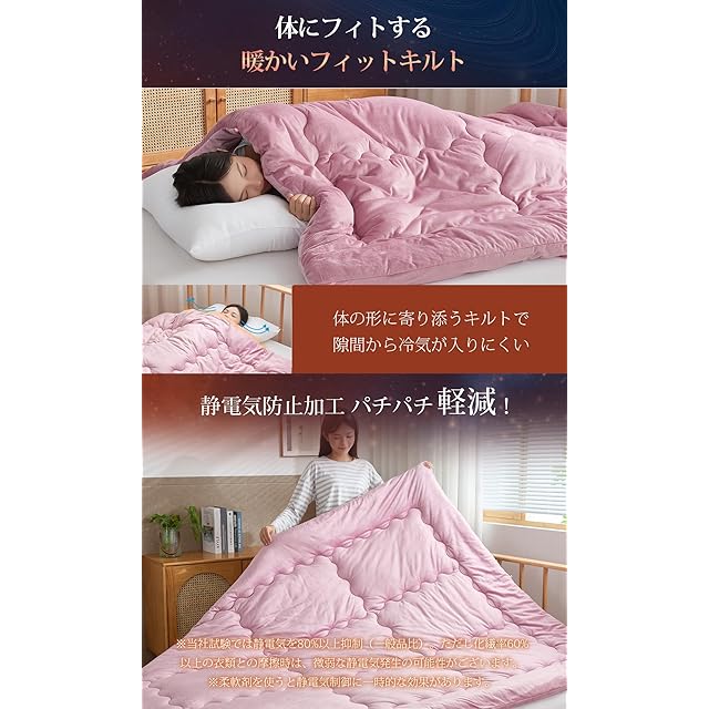 【宇宙服素材エアロゲル採用:奇跡の軽さと圧倒的保温性】最新の宇宙服素材であるエアロゲル繊維を中綿に使用。極小のナノファイバーが真空レベルの断熱層を形成することで、羽毛布団を超えるほどの保温性を実現。驚くほど軽く、身体への負担を感じさせません。まるで魔法のように軽やかな暖かさをぜひご体感ください。