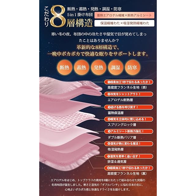 【8層構造で断熱・蓄熱・発熱・調湿・防寒】エアロゲル繊維に加え、吸湿発熱層、蓄熱層、遮熱アルミシートなどを重ねた8層構造設計。湿気を熱に変えて蓄えるため、朝までじんわりと暖かさが続きます。外気の冷たさもしっかりとガードし、寒い冬も朝までぐっすり快適に眠れます。