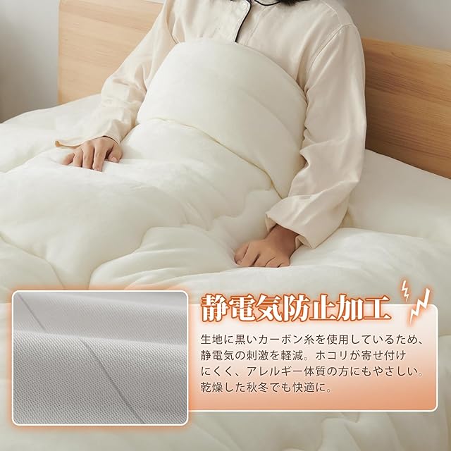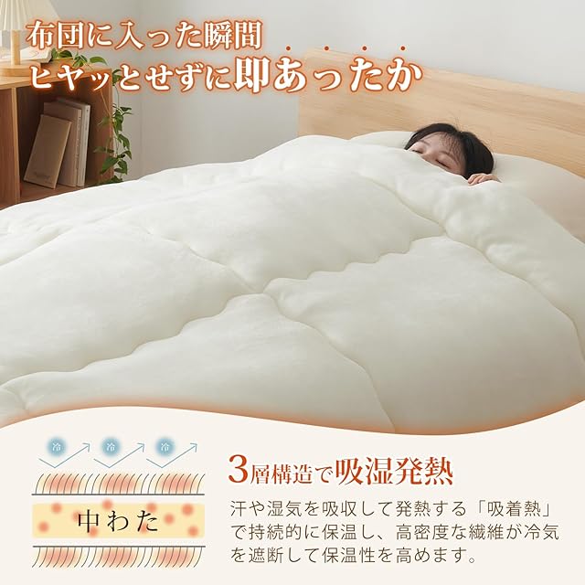 「軽量&ボリューム感」重さちょうどいい充填量で、体に余計な負担をかけません。それでもボリューム感を損なうことなく、普通の布団よりも保温性が高いです。