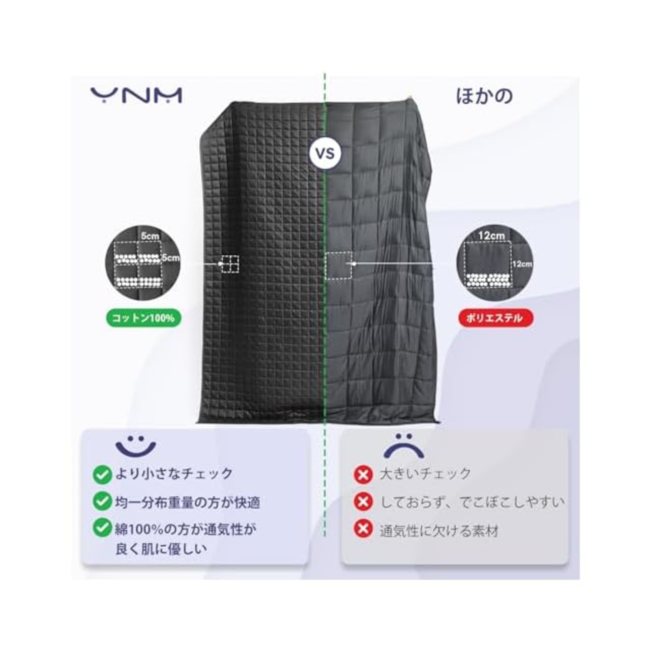 【重さの選び方】YNM加重ブランケットを選ぶとき、自分の体重の10%+1kgの重さがおすすめです。5.5kg【体重範囲 40kg~50kg】、7kg【体重範囲 50kg~70kg】、9kg【体重範囲 60kg~86kg】、11kg【体重範囲 70kg~108kg】。ブランケットサイズ:122×183cm(シングル布団)、152×203cm(シングル布団)。