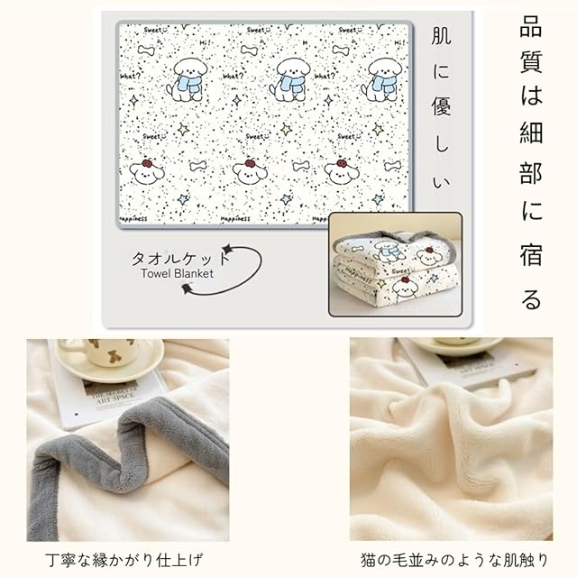 本商品は四季対応のタオルケットです。このタオルケットの主な特徴は以下となります: 1.多機能性 春夏秋の掛け布団として、ベッドシーツとして、旅行時やオフィスの休憩用として活用可能 2.快適な使用感 雲のようにふんわりとした肌触りで、通気性に優れた独自素材を使用 3.便利なお手入れ 洗濯機で丸洗い可能(色落ち・毛玉対策済み) 4.可愛いデザイン 表裏両面に動物プリントを施し、見た目も癒される