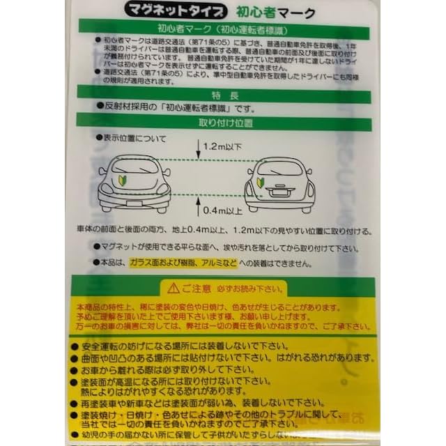 初心者マーク(マグネット タイプ)2枚セット。 金属部分に取りつける脱着可能タイプ。 反射効果で夜間も安全運転。 商品サイズ:縦185㎜x横115㎜x厚さ0.65mm。 材質:マグネットゴム お車から離れる際は必ず取り外してください。 道路交通法施行規則適合。