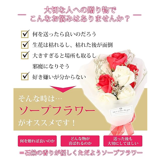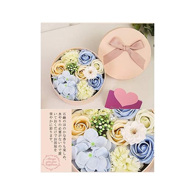 サイズ:16.2cm*16.2cm*8.2cm石鹸素材でつくった やさしい香りがするお花。 香りも楽しめるソープフラワーは、美しいまま長く楽しめるので、お誕生日プレゼントにはもちろん、結婚のお祝いや記念日の贈り物、母の日、父の日などのフラワーギフトに最適です♪