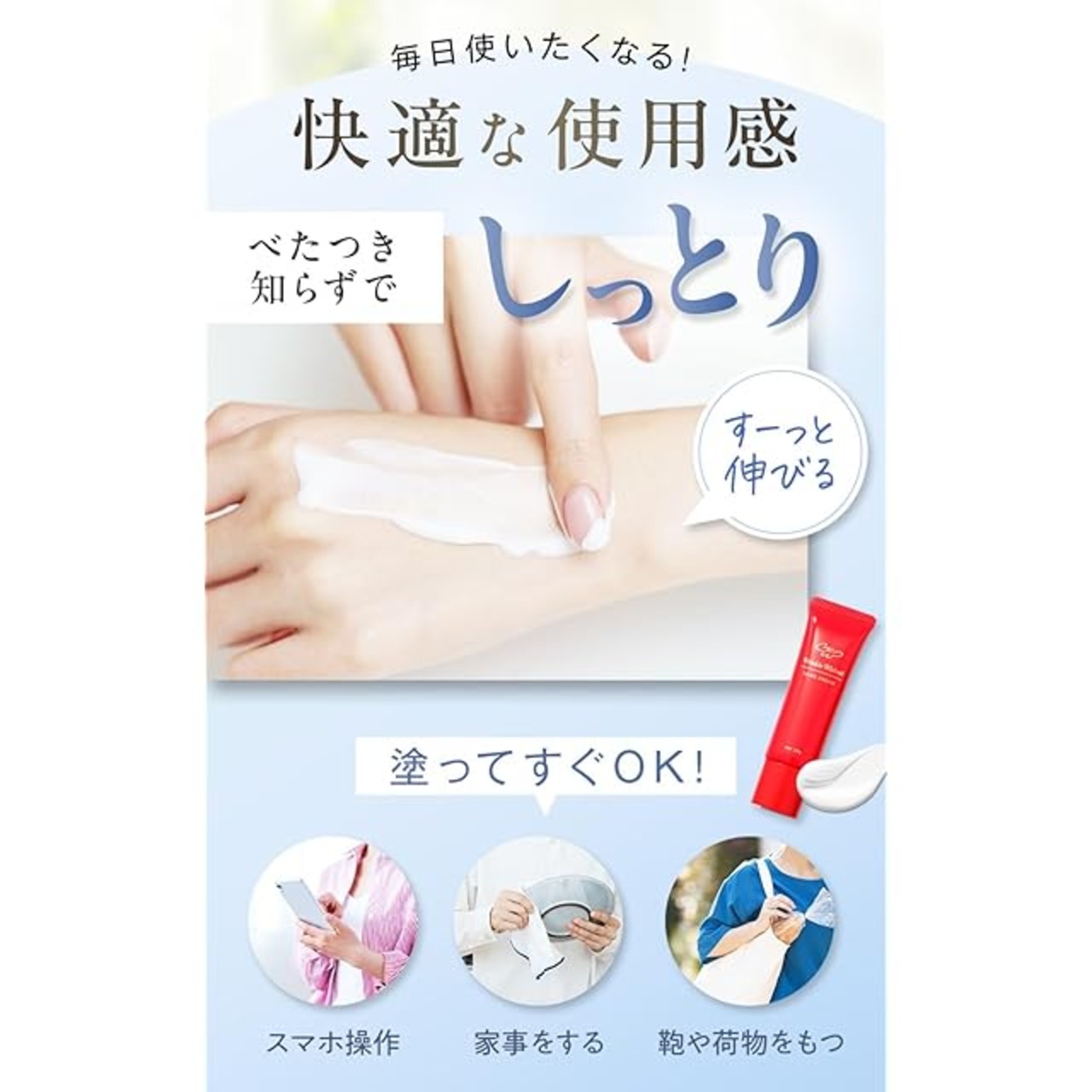 ✨【敏感肌にもやさしい5つのフリー処方】 肌への負担を最小限に抑えるため、パラベン・鉱物油・アルコール・タール色素・石油系界面活性剤フリー。敏感肌の方にもやさしい処方で、毎日安心してお使いいただけます。 また、日本国内で徹底した品質管理のもと製造された信頼の日本製ハンドクリーム。肌にやさしく、心地よい使用感を追求しました。
