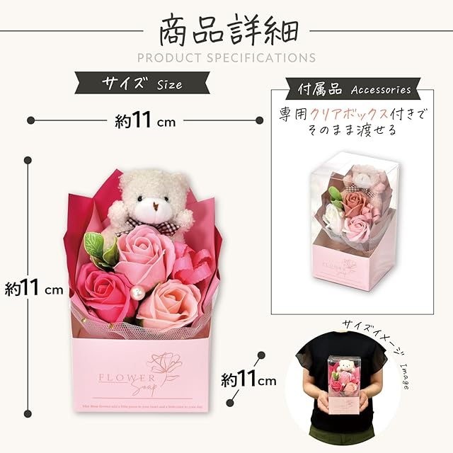 【ご使用上の注意】本商品は観賞用のソープフラワー(造花)です。石鹸として身体を洗う用途や、入浴剤としてのご使用はできませんのでご注意ください。また、小さなお子様やペットが誤って口に入れないよう、必ず手の届かない場所に保管してください。誤飲・誤使用を防ぐためにも、用途をご理解のうえ安全にお取り扱いください。※ご使用環境や個人差により、香りの感じ方には差があります。